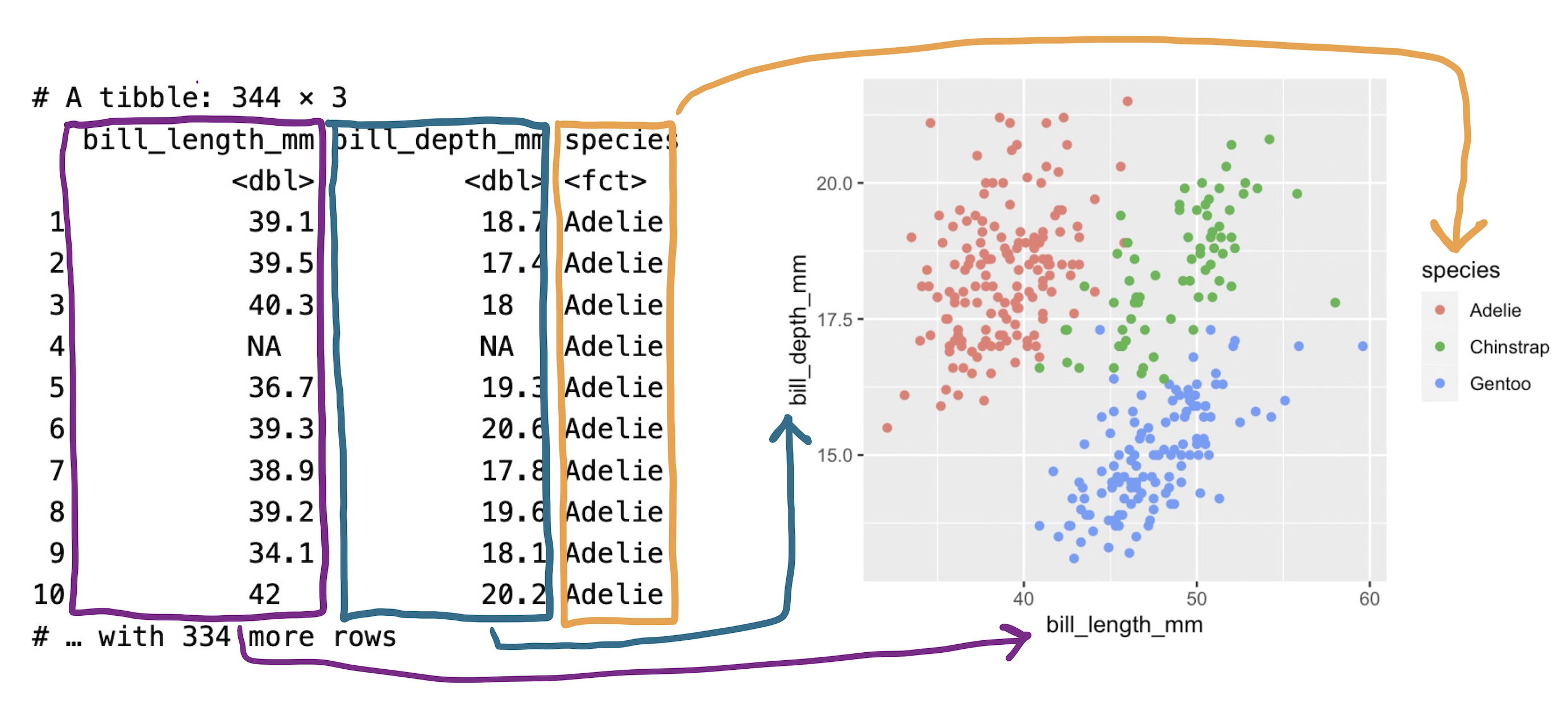 The basic idea that underpins ggplot2: a visualization is a mapping from variables in your data to aesthetic properties like position, color, size and shape.
